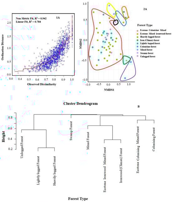 (1A) A stress vs. ordination distance plot, a diagnostic plot used to assess the quality of the ordination results from non-metric multidimensional scaling (NMDS) in species composition analysis; (2A) visualization of tree species composition of stem diameter (DBH ≥ 10 cm) using non-metric multidimensional scaling (NMDS): purple circle contains 2 plots for colonizing; green circle contain only 1 plot for ecotone between colonizing and mixed forest types; red circle contains 5 plots of unlogged, 15 plots of lightly logged, and 25 plots of heavily logged forest types; black circle contain only 1 plot of swamp tree community; yellow circle contains 2 plots of mixed forest type; blue circle contains 2 plots of ecotone between mixed and ironwood forest; and orange circle contains 2 plots of ironwood forest; and (B) dendrogram representing a hierarchical clustering of nine forest types based on species composition differences in Budongo rainforest, Uganda.