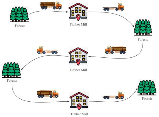 Transporting timber is a complex process from forest harvesting to end user delivery. This includes logging, sorting, quality checking, further transportation to timber mills, storage, and, finally, transportation to the end user for unloading and installation. The research process focuses mainly on the journey from the forest to the timber mills, as shown in Figure 1. In this phase, there are multiple forest farms and multiple timber mills. There is a weekly schedule between the forests and the timber mills, i.e., the number of deliveries each forest needs to make to each timber mill. Firstly, transportation vehicles need to be loaded with timber from a particular forestry site, usually with a full truckload. The vehicle then transports the timber to a particular timber mill to complete this delivery. Then, the transportation vehicle needs to depart from this timber mill and continue travelling to the next forest site, repeating the start of the job. Note that during this part of the transportation, the vehicle is empty.