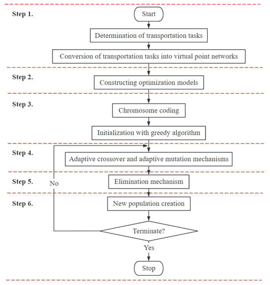 This paper presents an approach to addressing the issue of diminishing empty driving distance and carbon emissions, with the objective of attaining the optimal solution. In pursuit of this goal, a hybrid algorithm has been developed and employed to resolve the problem through a six-step procedure, as illustrated in Figure 2.