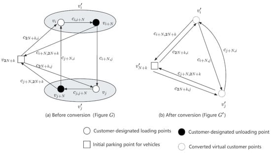 Since each transportation task must be finished, that is, a vehicle is assigned to travel from the corresponding loading point to the unloading point with a full truckload, the total transportation cost depends mainly on the cost of empty vehicles [35]. Therefore, the loading and unloading points can be regarded as virtual points . Transform Figure into Figure , before and after the transformation, as shown in Figure 3.