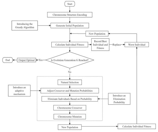 First, an initial population is generated using a combination of a greedy algorithm and random generation, ensuring both diversity and the inclusion of favorable solutions. This approach avoids starting the optimization with poor solutions, thus enhancing the optimization speed. Second, an adaptive mechanism is introduced to dynamically adjust the crossover and mutation probabilities based on population evolution, improving search efficiency and avoiding premature convergence. Finally, the culling mechanism removes unfit individuals, which can further aid convergence and improve the performance of the algorithm.