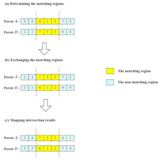 The partial matching crossover strategy is used to complete the crossover operation, and the specific steps are shown in Figure 5. By reasonably exchanging the genetic information of the parent individuals, is able to explore more extensively in the search space of the arrangement coding. This helps to find a more optimal solution. Firstly, a pair of paternal chromosomes is randomly selected and their matching regions are determined, as shown in Figure 5a. Second, exchange the matching regions of these two chromosomes, as shown in Figure 5b. Finally, determine the positional mapping relationships of the intermediate matching regions, such as 6–7, 1–5, and 2–3. Replace 3, 7, and 5 with 2, 6, and 1, respectively, for those outside the matching region of parent A. For 1, 2, and 6 outside the matching region of parent B, these are replaced by 5, 3, and 7, respectively. The crossover results are shown in Figure 5c.