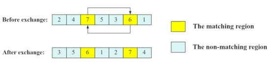 The mutation operation determines the ability of the genetic algorithm’s local search, and the reversed mutation strategy is used for individuals. The mutation operation is completed by randomly selecting two mutation points in an individual and exchanging the gene values of the two points, as shown in Figure 6.