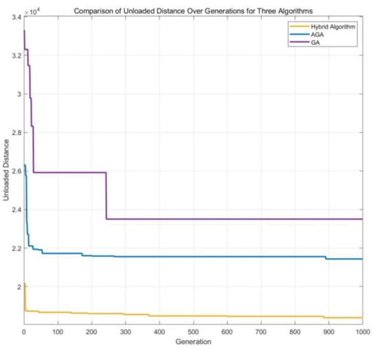 In the initial stage, the hybrid algorithm demonstrates a conspicuous advantage with respect to the initial solution it generates. The superior quality of this initial solution serves as a solid foundation for its subsequent favorable performance. Subsequently, in terms of convergence rate, the hybrid algorithm exhibits remarkable proficiency. It exhibits the fastest convergence speed among the three algorithms, attaining the minimum empty-loading distance in approximately 50 generations. The AGA follows, reaching a stable state after around 100 generations. In contrast, the GA requires a substantially longer time to stabilize, necessitating more than 200 generations to achieve a steady condition. Ultimately, the hybrid algorithm yields the smallest final empty-loading distance of 18,387 km, which represents a significant edge over both the AGA and the GA. To sum up, the proposed hybrid algorithm surpasses the AGA and the GA in minimizing the empty-loading distance.
