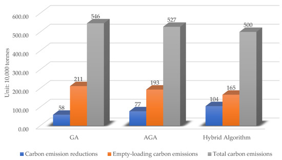 Figure 8 presents a bar chart that conducts a comparative analysis of carbon emission reductions among three distinct optimization algorithms: GA, AGA, and the hybrid algorithm. Each set of bars corresponds to the total carbon emissions, empty-loading carbon emissions, and carbon emission reductions of the respective algorithm. Among these algorithms, the hybrid algorithm stands out prominently. It achieves the most remarkable reduction in carbon emissions. This significant advantage clearly indicates that the hybrid algorithm has superior performance in optimizing transportation routes, thereby effectively minimizing the environmental impact to a great extent.