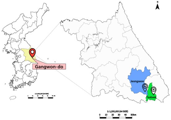 This research was conducted in the abandoned coal mining areas of Taebaek and Jeongseon, located in the southern region of Gangwon Province, South Korea (Figure 2). These locales were significant hubs of the coal industry during South Korea’s rapid economic growth in the 1960s and 1970s, with Taebaek and Jeongseon recognized as prominent mining towns during that era [66]. However, following the introduction of the Korean government’s “The Coal Industry Rationalization Policy” in 1989, these regions experienced a substantial decline in population, economic stagnation, and urban deterioration [67,68,69]. Furthermore, land degradation resulting from mining activities has become a pressing environmental issue. As of 2021, there were 7181 reported instances of mining-related damage, which included forest degradation, ground subsidence, and soil contamination, across 3300 inactive and abandoned mines nationwide [70], with forest degradation accounting for the largest share at 32% (2,324 cases) [12].