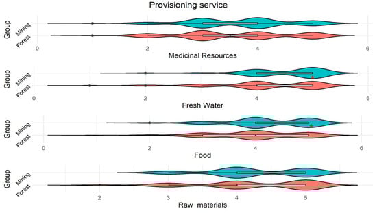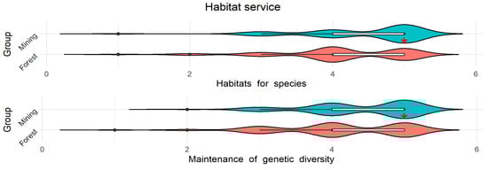 The appropriateness of the 18 ecosystem services, assessed using a Likert scale, was evaluated through an independent samples t-test to discern differences between the forestry and mining sectors. The hypothesis tested posited that there would be no significant difference between the mean ratings of the two groups for specific ecosystem services (null hypothesis). This statistical analysis was executed using R programming software, with a significance level set at p < 0.05. The findings were depicted using violin plots, which effectively illustrated the distribution, density, and central tendency of responses within each group. The selection of violin plots was justified on the grounds that they offer a more nuanced visualization compared to traditional box plots, thereby highlighting subtle differences in ecosystem service evaluations between the two sectors.