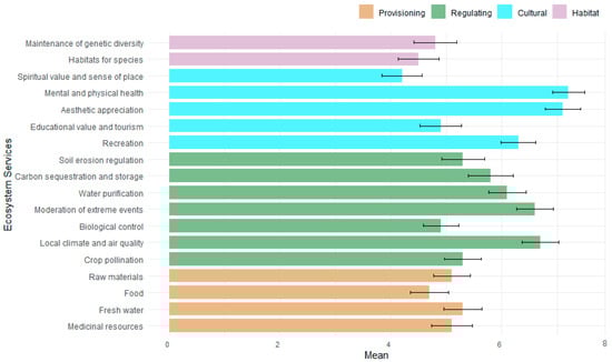 In the community survey, negative values were transformed for analytical purposes to assess perceptions of ecosystem services as either positive or negative. Specifically, scores ranging from −5 to −1, indicative of negative impacts, were recoded to a scale of 1 to 5, while scores from 1 to 5, reflecting positive impacts, were recoded to a scale of 6 to 10 (Table 2). Mean scores were computed to evaluate the relative significance of each item, thereby facilitating the ranking of ecosystem services based on their perceived importance within the community. The results were presented using mean scores rather than median scores to more effectively capture subtle variations that may not be apparent when relying solely on median values [72].