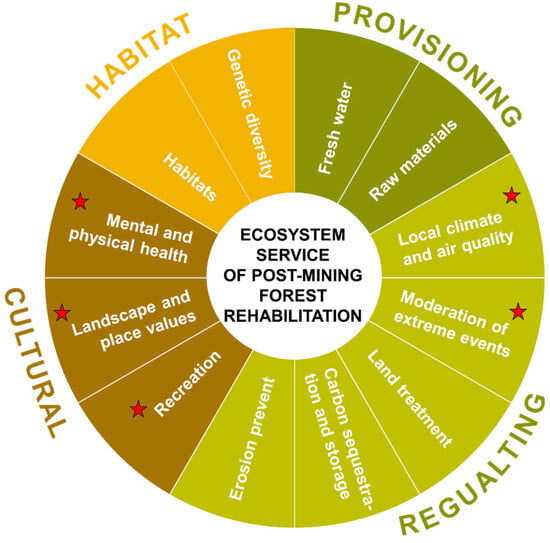 The rehabilitation of forest areas that have been degraded by mining activities is an essential strategy for restoring these ecosystems to a self-sustaining state. This process not only reinstates ecological functions and promotes positive outcomes such as biodiversity conservation but also provides benefits to local communities [39,40]. Specifically, forest rehabilitation serves as a strategic approach to recover the ecological integrity compromised by mining and to restore vital ES. Consequently, degraded areas can regain their productivity and stability, thereby achieving a harmonious balance between human needs and natural ecosystems, while simultaneously mitigating risks to the ecological and public health of the local community [41].