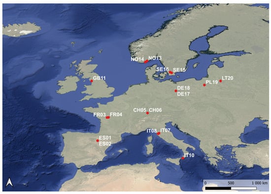 This research analyzed 3784 leaves from 419 trees across 18 populations of Quercus petraea (Matt.) Liebl. The goal was to examine the variations in leaf size and shape within the species using geometric morphometric methods (GMMs). This research covered a large European area, including 10 countries: France, Germany, Italy, Lithuania, Norway, Poland, Spain, Sweden, Switzerland, and the United Kingdom. The Q. petraea leaves’ collection was carried out as a part of the GenTree project (EU-Horizon 2020, [52]), aimed at characterizing the genetic and phenotypic variability in forest tree species to optimize the management and sustainable use of forest genetic resources [53]. Within the GenTree project, populations were sampled in local pairs (except for Lithuania and Poland) where two populations per single locality were selected across a local gradient (such as elevation and water availability) but with significant potential for gene flow. However, in this study, not all the populations were considered in pairs, since some specimens of one of the two populations were found to be too damaged to be used for the GMMs measurements (Table 1, Figure 1). An average of 9 leaves per tree were collected from a fully lit branch from the top of the crown selecting those without visible herbivory or other damage and subsequently scanned to assess leaf area. They were then oven-dried at 60 °C for 72 h, ground, and analyzed for carbon and nitrogen content (C:N, no units) and isotope 13C and 15N content in plant material (δ 13C, δ 15N reported relative to V-PDB, ‰). Leaf collection, storage, processing, and morphological trait measurement followed Pérez-Harguindeguy et al. [54], while the chemical analyses were carried out using gas chromatography–combustion isotope ratio mass spectrometry (GC-C-IRMS) at the UC Davis Stable Isotope Facility (https://stableisotopefacility.ucdavis.edu/ accessed on 13 April 2020). All this information is available in Benavides et al. [53].