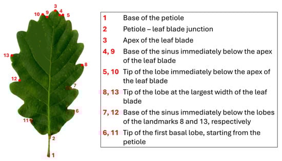 The first ones (LMs 1–3) were located along the middle axis of the leaf, while the second ones (LMs 4–13) were placed on both sides of the leaf (Figure 2).