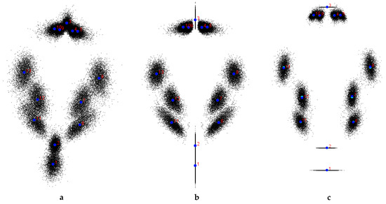 Generalized Procrustes Analysis (GPA) of the leaf shape of Quercus petraea based on the coordinates of the 13 landmarks using: (a) full raw coordinate matrix, (b) GPA symmetric component of shape, and (c) GPA asymmetric component of shape. The blue dots represent the mean landmark positions, and the small black dots represent the landmark positions for individual configurations in the sample.