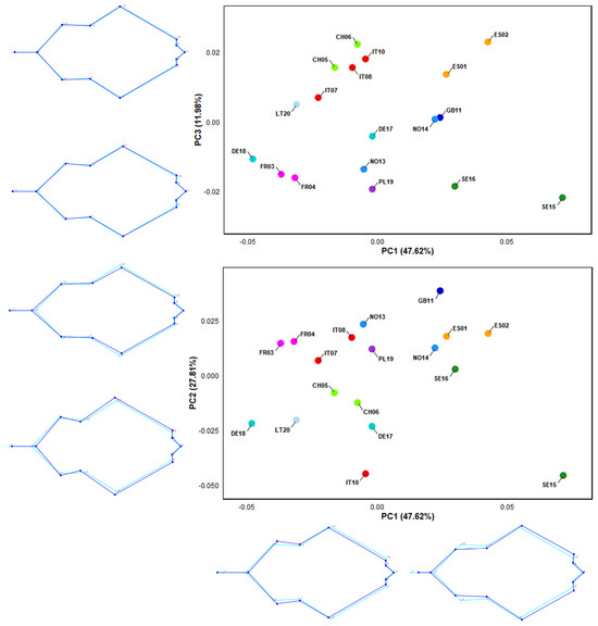 Principal component analysis (PCA) performed on the symmetric components of the leaf shape, considering both the “leaf matrix” and “tree matrix”, showed a significant overlap of the leaf shape among the populations considered. Accordingly, no discontinuities among populations along the main PCs were observable in the two scatterplots (see Figures S1 and S2). The scatterplot of the first three PC scores computed on the symmetric components of the leaves showed a light pattern of variation (87.41% of cumulative variance) among populations (Figure 4). Indeed, a light leaf shape variation is identifiable by looking at the wireframe graphs showing the difference between the average shape (the light blue outline), which represents the mean shape in the sample of 18 populations, and the target shape (the dark blue outline) that represents the shape change of interest (here, it is associated with the position of each population in the first three principal components). The most significant shape variations were recorded along PC1, which captures the variation in petiole length and the leaf blade width. A general shortening of the petiole, a shrinkage of the basal part of the leaf, and a widening of the upper part of the leaf emerged when moving from the negative to the positive end of the axis.