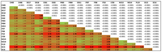Mahalanobis distances [64] among the populations of Quercus petraea derived from shape variables (below the diagonal) and p-values from multivariate permutation tests (10,000 permutation rounds) using Pillai’s trace (above the diagonal). The color code shows the Mahalanobis distance from low (green) to high (red) values.
