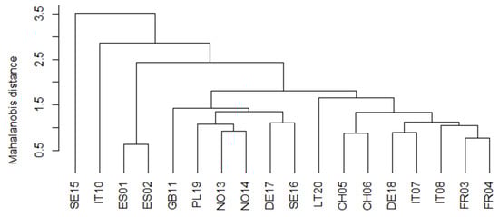 The Mahalanobis distances were calculated to quantify the differences in leaf shape among populations. The results showed that the greatest Mahalanobis distance value (4.39) was found between the Swedish population SE15 and the French one FR04, the lowest (0.63) was found between the two Spanish populations (ES01 and ES02) (Figure 5). The relationships among population leaf shapes are shown in the phenogram generated from UPGMA cluster analysis based on the Mahalanobis distances (Figure 6).