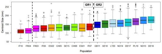 Boxplots showing the variation in centroid size values (mm) for the 419 trees belonging to the 18 populations analyzed. Boxes represent the interquartile range (IQR, 25th to 75th percentiles), the bold black line inside each box is the median, and the whiskers cover ± 1.5 × IQR. Circles indicate outliers. Populations are sorted by increasing the mean value of the centroid size. The dotted line separates populations belonging to the group 1 (GR1) and group 2 (GR2). The same color code of Figure 4 is used.