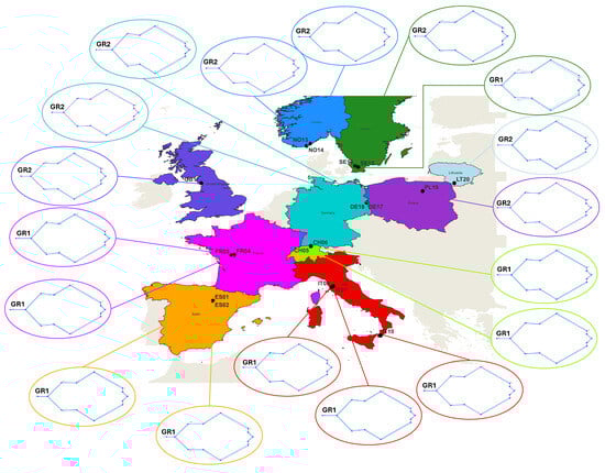 The second division, observable in the diagram of variation for the leaf centroid size, separates the population set approximately into two groups, of which one is composed exclusively of populations of southern Europe (GR1), and one is composed of the populations from central–northern Europe (GR2). This separation was statistically confirmed by an ANOVA and is observable on the geographic map in Figure 8, where a clear geographical separation of the populations into two groups is evident based on the centroid-size value being higher or lower than the average value. The only exception is the Swedish population already mentioned above (SE15), which, with a centroid size lower than the average, is positioned in the southern European group of populations (GR1). The peculiarity of SE15 also emerges in the UPGMA cluster analysis of the matrix based on a canonical analysis of Procrustes coordinates of the leaf shape, where this population represents the one most isolated from all the others.