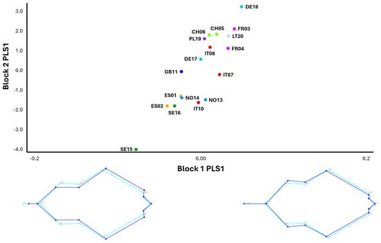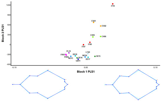 Scatterplots of the 2B-PLS analysis showing the relations between altitude and latitude (Block 2 PLS1) and the symmetric components of the shape (Block 1 PLS1) of the leaves of Quercus petraea studied. The wireframe graphs represent the leaf shapes at the negative (−0.025) and positive (+0.04) extremes of the PLS1 axis. RV: 0.1578; r: 0.76; p-value: 0.0043. The same color code of Figure 4 is used.