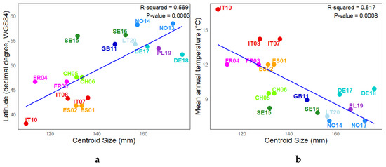 (a): regression of the centroid size values (mm) of each Quercus petraea population analyzed on the latitude (decimal degree, WGS84); (b): regression of the centroid size values (mm) of each Quercus petraea population analyzed on the mean annual temperature (°C) (1985–2015). The same color code of Figure 4 is used.