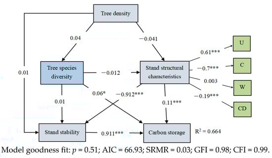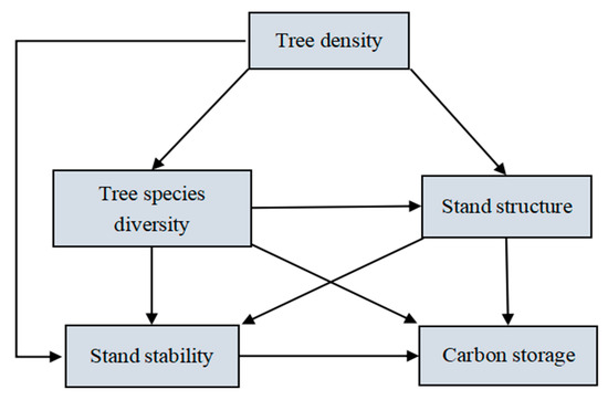 - Is there a direct or indirect relationship between tree density, tree species diversity, stand structural characteristics, stand stability, and carbon storage?