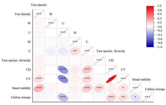 - How are tree density, tree species diversity, stand structural characteristics, stand stability, and carbon storage correlated?