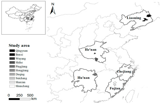 Zhejiang, Fujian, and Hunan is are known as the southern collective forest regions; Henan is in the north central plains; and Liaoning is in the northeast. The conditions of collective forests (e.g., collective stock volume of established forests, collective area of established forests, collective plantation area, and collective stock volume of plantation) in all case study provinces have been increasing from the sixth National Forest Resource Inventory (NFRI) (1998–2003) to the eighth NFRI (1998–2013) [32].