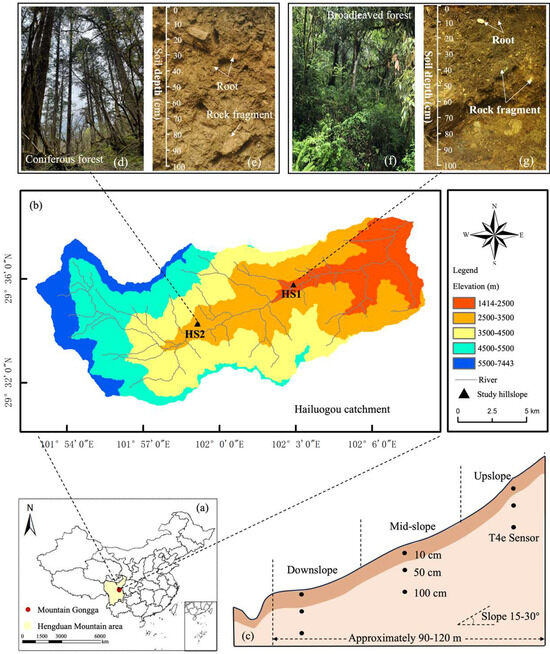 The location of the study site on the eastern slope of Gongga Mountain, which is situated at the east end of the Qinghai–Tibet Plateau (a); an overview of the Hailuogou Valley catchment (b); conceptualization diagram of the study hillslopes and monitoring point locations (c); the vegetations and soil profiles of HS1 and HS2 (d–g).