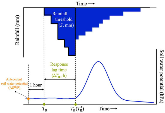 Conceptual diagram of soil water potential response processes to rainfall. represents the initial time of the rainfall event; denotes the time of soil water potential response at a specific depth (n = 1, 2, 3, corresponding to depths of 10 cm, 50 cm, and 100 cm, respectively); is the response lag time at a specific depth, calculated as ; ASWP refers to the antecedent soil water potential, measured one hour prior to . S is the cumulative rainfall amount required to trigger a measurable SWP response at a specific soil depth.