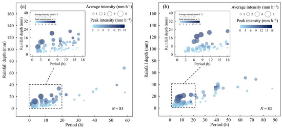 Depth (RD), period (RP), peak intensities (Inpeak), and average intensities (Inaver) of all rainfall events on HS1 (a) and HS2 (b) hillslopes, respectively.