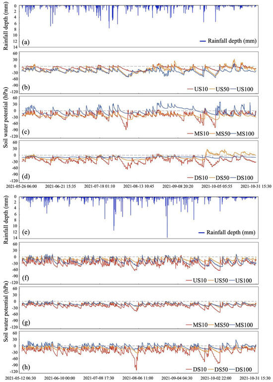 Temporal variations in rainfall and corresponding average soil water potential (SWP) at 10 cm, 50 cm, and 100 cm of different positions on HS1 ((a)—rainfall, (b)—upslope, (c)—mid-slope, (d)—downslope) and HS2 ((e)—rainfall, (f)—upslope, (g)—mid-slope, (h)—downslope).
