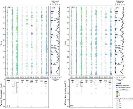 Wetting front velocity () across hillslopes, HS1 (a1,a2) and HS2 (b1,b2), with rainfall depth (blue bars) and peak intensity (grey filled circles) of each rainfall event (a3,b3). The box plot depicts the variation in across soil depths and hillslope positions (grey open circles are outliers). Symbol color represents the antecedent soil wetness condition (ASWP, hPa), and diameter represents the magnitude of . US, upslope; MS, mid-slope; DS, downslope. 10, 50, and 100 indicate the soil depths of 10 cm, 50 cm, and 100 cm.