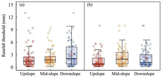 Rainfall thresholds (S) to trigger soil water potential response at different hillslope positions of HS1 (a) and HS2 (b).