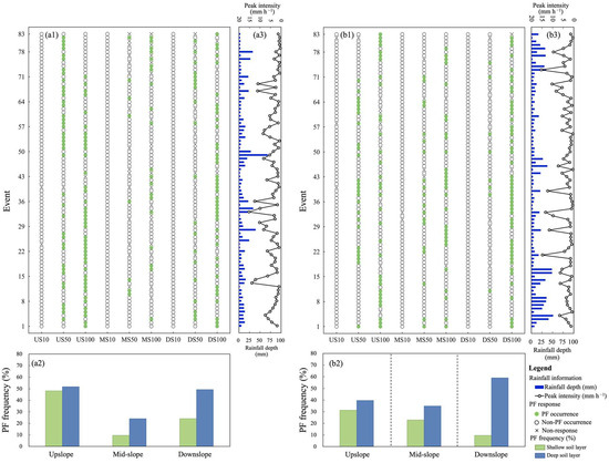 The occurrence (a1,b1) and frequencies of preferential flow (a2,b2) across HS1 and HS2, with rainfall depth (blue bars) and peak intensity (grey filled circles) of each rainfall event (a3,b3). Black circles indicate non-preferential flow; green filled circles indicate the occurrence of preferential flow; black crosses indicate non-response.