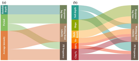 Relative importance of the temporal (a) and site (b) factors for soil water potential response metrics (response lag time, wetting front velocity, and preferential flow frequency) from Multivariate Adaptive Regression Spline models. Wider links indicate greater importance. Ks, hydraulic conductivity; Silt%, silt content of soil; Clay%, clay content of soil.