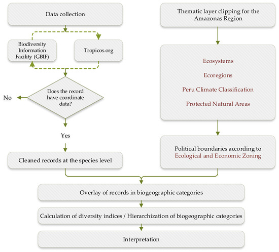 The methodology used is shown in Figure 1. The data were downloaded from the Global Biodiversity Information Facility database https://www.gbif.org/ (accessed on 13 August 2024), to obtain information on the records of species of the Arecaceae family, such as scientific name, genera, family, geographic coordinates, altitude, and origin (continent, country, state, or province), among other data. Records at the subspecies level were excluded, limiting the analysis exclusively to the species level. Following the recommendations of [31], records were compared and contrasted with the Tropicos.org database https://www.tropicos.org/home (accessed on 20 August 2024). Then, the data were cleaned according to the method of García and collaborators [38], using spreadsheet filters to eliminate incomplete records, such as those without geographic coordinates and incorrect or questionable data. In addition, we verified that the coordinates were within the political boundaries of the Amazonas department.