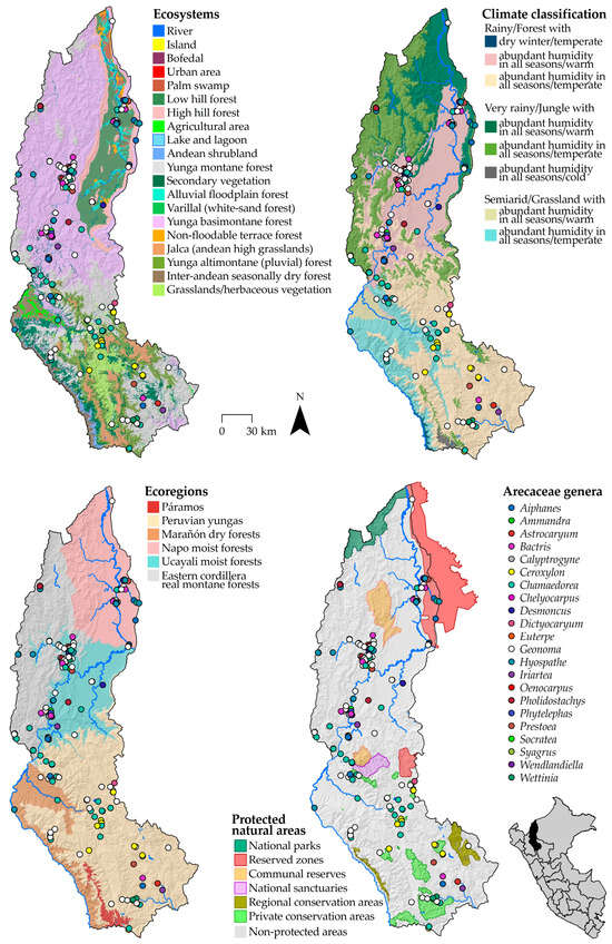 Arecaceae species are associated with specific habitats [14] and show significant morphological and functional variation [15]. Furthermore, anatomical knowledge of many species is still limited [16], which prevents a complete understanding of their global distribution [17]. Difficulties in the classification of Arecaceae species are aggravated by the tendency to represent their distribution considering political boundaries [18] instead of biogeographic trends or patterns, which reflect areas with relatively homogeneous ecological conditions or similarities at the biological level [19]. In the Peruvian context, studies such as the Analysis of the Ecological Cover of the National System of Natural Areas Protected by the State have provided limited information on species diversity in Peru’s ecoregions [20]. Similarly, the National Map of Ecosystems presents scarce data on the presence of species in Peruvian ecosystems [21].