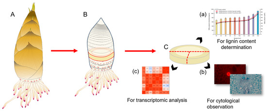Workflow for sampling and experimental treatment of Moso bamboo shoots. (A) Schematic representation of bamboo shoots’ morphology. (B) Schematic diagram showing the sampling sites on the bamboo shoots used in the experiment. (C) Cross-section of the bamboo shoots used in the experiment. (a) Section used for lignin content determination. (b) Section preserved in FAA fixative solution for cytological observation. (c) Section used for transcriptomic analysis.