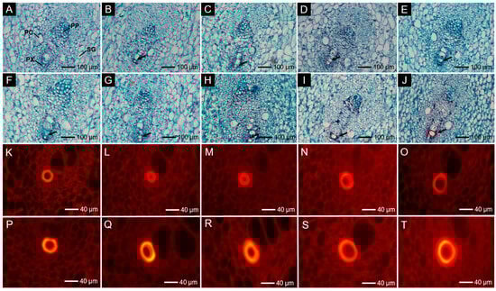 Paraffin sections were prepared to observe cellular morphology. Samples preserved in FAA were subjected to a series of steps including dehydration, transparency treatment, embedding, sectioning, staining with Safranin-O Fast Green solution, and mounting to create permanent sections [24,25]. Transverse sections of vascular bundles were obtained using an RM2235 rotary microtome (Leica, Wetzlar, Germany), with a section thickness of 8 μm. Anatomical changes in the transverse sections of vascular bundle were observed. Microphotographs were captured using an AX10 fluorescence microscope (Zeiss, Jena, Germany) and measured by ImageJ (v1.8.0.345) software.