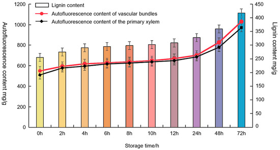 The lignin content, vascular bundle fluorescence content, and spontaneous fluorescence content of the bamboo shoots were measured over time (Figure 3). From 0 h to 4 h postharvest, there was a rapid increase in lignin content, followed by a slower growth trend. However, after 12 h of storage, all three types of content types exhibited a rapid increase (Table S2). To evaluate the significance of changes in the content of various substances between adjacent time points, we conducted t-tests for the three substances (Table S3) and visualized the trends using bar charts (Figure S2). The results revealed that during the early storage period (0 h to 4 h), the differences between time points were not statistically significant (p > 0.05). However, in the later stages of storage (12 h to 24 h and 48 h to 72 h), the differences became significant (p < 0.05). By contrast, the autofluorescence content, measured both in vascular bundles and primary xylem, exhibited significant differences across all time points, with extremely low p-values (<0.00001), particularly during transitions from 12 h to 24 h and 48 h to 72 h. Meanwhile, we measured the changes in the area, thickness, and diameter of the primary xylem in vascular bundles over time (Table S4). The data show that the primary xylem exhibited distinct trends with increasing storage time (Figure S3). A linear regression model was employed to generate the fitted curves for the primary xylem data (Table S5). The analysis revealed that the area, thickness, and diameter of the primary xylem exhibited significant changes during storage. The area initially decreased (0 h to 6 h) but then increased rapidly, with the growth rate gradually slowing but continuing to rise. The thickness and diameter showed a consistent increase during the early storage period, slight fluctuations in the mid-stage, and resumed growth in the later stages. Overall, the primary xylem parameters demonstrated significant changes during the early storage period, followed by a period of relatively steady growth (Figure S4).