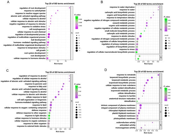 Description of differentially expressed genes (DEGs) analysis. GO analysis of specifically expressed genes in shoots. (A) 0 h. (B) 4 h. (C) 12 h. (D) 48 h. (BP) biological process. (CC) cellular component. (MF) molecular function. The color scale indicates the p-value and the dots represent the number of genes enriched in the pathway.