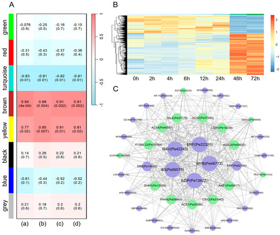 Weighted Gene Co-expression Network Analysis (WGCNA) of identified differentially expressed genes (DEGs). (A) Module–trait relationships. (a) Storage times. (b) Lignin content. (c) Autofluorescence content of vascular bundles. (d) Autofluorescence content of the PX. The scale indicates the correlation between the module and trait. (B) Gene expression profile of the brown module. The color scale indicates the relative expression of genes. (C) The protein interaction regulatory network in the brown module, with transcription factors highlighted in purple.