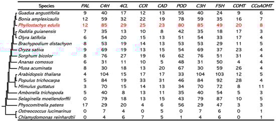 We selected the protein sequences of 18 whole-genome sequenced species based on the phylogeny of green plants, including 5 bamboo plants (Bonia amplexicaulis (Thwaites) Stapleton, Guadua angustifolia Kunth, Phyllostachys edulis, Olyra latifolia L., Raddia guianensis (Brongn.) Hitchc.), 5 other monocots (Brachypodium distachyon (L.) P. Beauv., Oryza sativa L., Sorghum bicolor (L.) Moench, Ananas comosus (L.) Merr., Musa acuminata Colla), 3 eudicots (Populus trichocarpa Torr. & A. Gray, Arabidopsis thaliana (L.) Heynh., Mimulus guttatus DC.), 1 basal angiosperm (Amborella trichopoda Baill.), 1 lycopod (Selaginella moellendorffii Hieron.), 1 moss (Physcomitrella patens (Hedw.) Bruch & Schimp.), and 2 green algae (Chlamydomonas reinhardtii P. A. Dangeard, Ostreococcus lucimarinus C. L. Foulon & Courties). The sequences were downloaded from NCBI (https://www.ncbi.nlm.nih.gov/, accessed on 10 September 2024) or Phytozome (https://phytozome-next.jgi.doe.gov/, accessed on 11 September 2024). BLASTP (v2.7.1) was used to obtain the protein sequences of candidate genes for corresponding gene families [38]. The obtained sequences were then submitted to the Pfam (http://pfam.xfam.org/, accessed on 21 September 2024) and SMART (http://smart.embl-heidelberg.de/, accessed on 24 September 2024) databases for domain validation. Sequences that were not full length, lacked the corresponding gene family domains, or had alignment length values less than 70% of the maximum value for the respective gene family were excluded. Ultimately, the protein and cds sequences of ten gene families encoding the key enzymes involved in lignin synthesis were obtained.