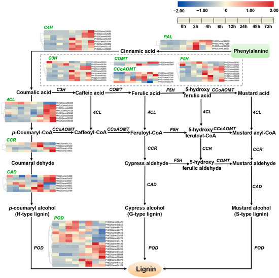 Among the various phenomena occurring postharvest, lignification has the greatest impact on the taste and edible value of fresh bamboo shoots. As highly growth-capable young sprouts, Moso bamboo shoots exhibit robust metabolic activity and are prone to lignification postharvest, leading to significant synthesis and accumulation of lignin. Lignin is a key component of the cell wall and cell structure and its biosynthesis in plants is a complex physiological and biochemical process involving various enzymes [6]. Previous studies on model plants such as Arabidopsis, woody plants, and various crops have elucidated the biosynthesis of lignin and its related regulatory pathways [7,8,9]. As a polymer composed of multiple monomers, lignin is primarily formed through the polymerization of three different monolignols: p-hydroxyphenyl lignin (H-lignin), derived from coniferyl alcohol and predominantly found in grasses; guaiacyl lignin (G-lignin), derived from sinapyl alcohol and prevalent in angiosperms; and syringyl lignin (S-lignin), derived from p-coumaryl alcohol and widely distributed in seed plants [10,11,12,13]. The synthesis of lignin in plants involves a series of key enzymes, including phenylalanine ammonia lyase (PAL), cinnamate 4-hydroxylase (C4H), 4-coumarate-CoA ligase (4CL), cinnamoyl-CoA reductase (CCR), cinnamyl alcohol dehydrogenase (CAD), peroxidase (POD), cinnamic acid 3-hydroxylase (C3H), ferulate 5-hydroxylase (F5H), caffeic acid O-methyltransferase (COMT), caffeoyl-CoA O-methyltransferase (CCoAOMT), etc. [14,15,16,17,18].