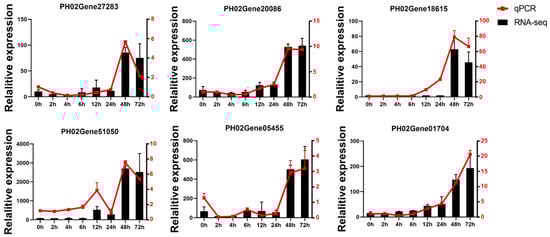 To validate the accuracy of RNA-seq data under postharvest ambient temperature storage conditions for bamboo shoots, qRT-PCR analysis was performed on six key DEGs across eight time points (Table S9). The qRT-PCR results showed a high degree of concordance with the RNA-seq data, thereby confirming the reliability of the RNA-seq results (Figure 8). Among the validated genes, PH02Gene27283 and PH02Gene20086 were enriched in the JA response pathway, as determined by GO analysis. PH02Gene18615 and PH02Gene51050 were associated with pathways related to plant resistance. Additionally, PH02Gene05455 and PH02Gene01704 were identified as a CAD enzyme gene and 4CL enzyme gene, respectively. These genes are believed to play crucial roles in regulating the resistance of bamboo shoots to environmental stress and are key contributors to the rapid lignification observed postharvest.