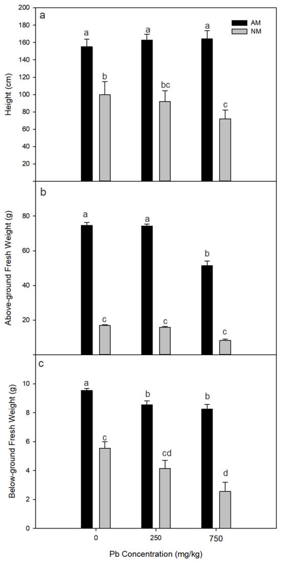 Effect of arbuscular mycorrhizal (AM) fungus on the growth of poplar (Populus simonii × P. nigra ‘1307’) under varying lead (Pb) stress conditions: (a) Height (cm); (b) Above-ground Fresh Weight (g); (c) Below-ground Fresh Weight (g). Note: Values represent means ± standard deviation (n = 5). AM: Plants inoculated with arbuscular mycorrhizal fungus (Rhizophagus irregularis); NM: Non-inoculated plants (control group without AMF inoculation). Different letters (a–d) indicate significant differences at p < 0.05.