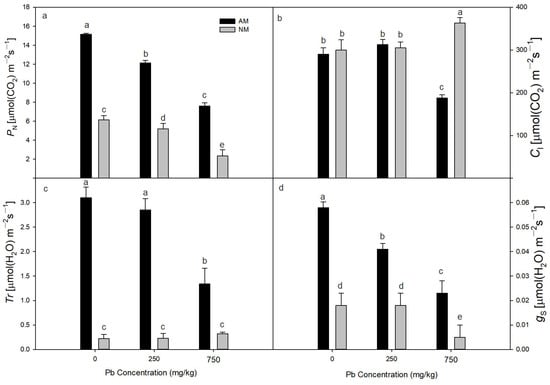 Effect of Arbuscular Mycorrhizal (AM) Fungus on the Photosynthetic Parameters of Poplar (Populus simonii × P. nigra ‘1307’) under Varying Lead (Pb) Stress Conditions: (a) Net photosynthetic rate [PN, μmol(CO2)m−2s−1]; (b) Intercellular CO2 concentration [CI, μmol(CO2)m−2s−1]; (c) Transpiration rate [Tr, μmol(H2O)m−2s−1]; (d) Stomatal conductance [gs, μmol(H2O)m−2s−1]. Note: Values represent means ± standard deviation (n = 5) at p < 0.05. AM: Plants inoculated with arbuscular mycorrhizal fungus (Rhizophagus irregularis); NM: Non-inoculated plants (control group without AMF inoculation). Different letters (a–e) indicate significant differences at p < 0.05.