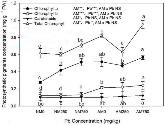 Effect of arbuscular mycorrhizal (AM) fungus on the chlorophyll content of poplar (Populus simonii × P. nigra ‘1307’) under varying lead (Pb) stress conditions. Note: Values represent means ± standard deviation (n = 5). NS indicates no significant difference (p > 0.05). Significant effect of two-way ANOVA: * p < 0.05, ** p < 0.01, *** p < 0.001. Pb represents Pb application, AM represents AM fungal treatment, AM × Pb represents the interaction between AM fungal treatment and Pb application. AM: Plants inoculated with arbuscular mycorrhizal fungus (Rhizophagus irregularis); NM: Non-inoculated plants (control group without AMF inoculation). Different letters (a–d) indicate significant differences at p < 0.05.