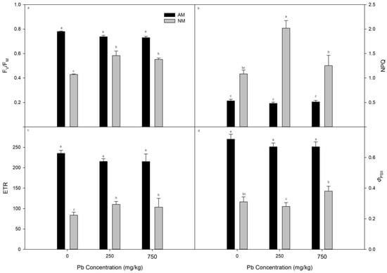 Effect of arbuscular mycorrhizal (AM) fungus on the fluorescence parameters of poplar (Populus simonii × P. nigra ‘1307’) under varying lead (Pb) stress conditions: (a) Maximum quantum yield of photosystem II (Fv/Fm); (b) Non-photochemical quenching (NPQ); (c) Electron transport rate (ETR); (d) Effective quantum yield of photosystem II (ΦPSII). Note: Values represent means ± standard deviation (n = 5) at p < 0.05. AM: Plants inoculated with arbuscular mycorrhizal fungus (Rhizophagus irregularis); NM: Non-inoculated plants (control group without AMF inoculation). Different letters (a, b, c) indicate significant differences at p < 0.05. ETR: Electron Transport Rate, measured in μmol electrons m−2 s−1.