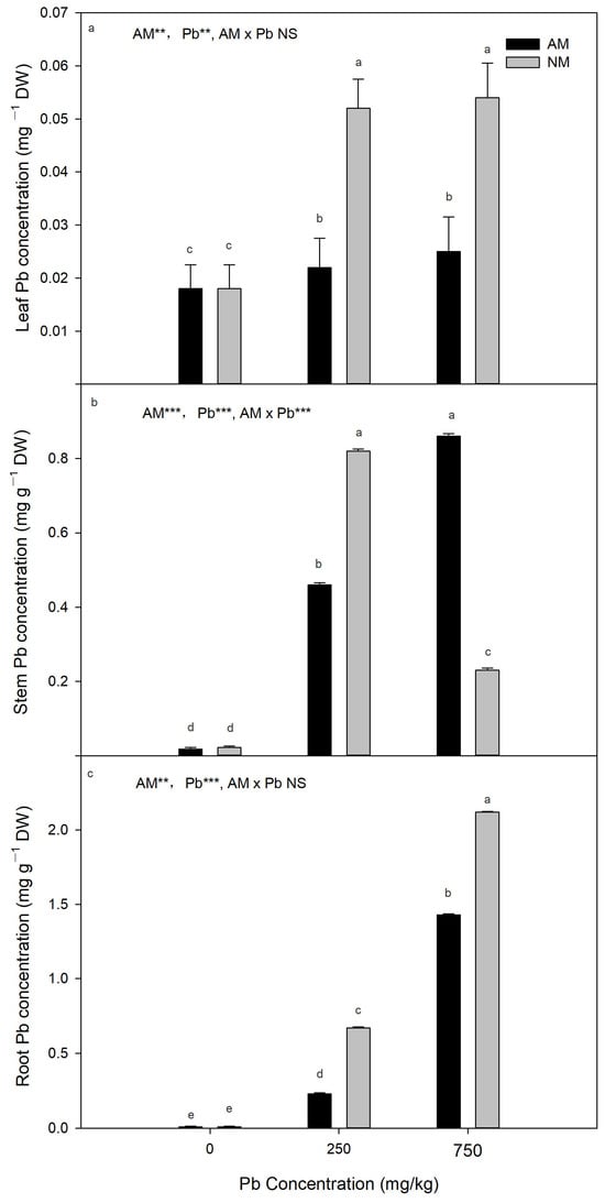 Pb concentrations in leaves, stems, and roots of poplar under AM fungi inoculation and Pb stress conditions: (a) Lead concentration in leaves (mg g−1 DW); (b) Lead concentration in stems (mg g−1 DW); (c) Lead concentration in roots (mg g−1 DW). Note: Values represent means ± standard deviation (n = 5). NS indicates no significant difference (p > 0.05). Significant effect of two-way ANOVA: ** p < 0.01, *** p < 0.001. Pb represents Pb application, AM represents AM fungal treatment, Pb × AM represents the interaction between AM fungal treatment and Pb application. Note: Values represent means ± standard deviation (n = 5) at p < 0.05. AM: Plants inoculated with arbuscular mycorrhizal fungus (Rhizophagus irregularis); NM: Non-inoculated plants (control group without AMF inoculation). Different letters (a, b, c) indicate significant differences at p < 0.05. Different letters (a–e) indicate significant differences at p < 0.05.