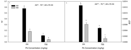 Effect of arbuscular mycorrhizal (AM) fungus on inoculation on transfer factor and bioconcentration factor of poplar (Populus simonii × P. nigra ‘1307’) under varying lead (Pb) stress conditions: (a) Transfer factor (TF) of Pb under different Pb concentrations; (b) Bioconcentration factor (BCF) of Pb under different Pb concentrations. Note: Values represent means ± standard deviation (n = 5). NS indicates no significant difference (p > 0.05). Significant effect of two-way ANOVA: ** p < 0.01, *** p < 0.001. Pb represents Pb application, AM represents AM fungal treatment, Pb × AM represents the interaction between AM fungal treatment and Pb application. AM: Plants inoculated with arbuscular mycorrhizal fungus (Rhizophagus irregularis); NM: Non-inoculated plants (control group without AMF inoculation). Different letters (a–d) indicate significant differences at p < 0.05.